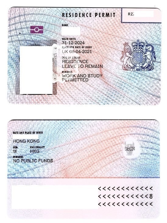A photo of the two sides of a biometric residence permit for Hong Kong nationals. Sample of a residence permit, with personal data redacted. Fields on the permit include: Name, valid until, place and date of issue, type of permit (‘residence leave to remain’), remarks (‘work and study permitted’), date and place of birth, sex, nationality, remarks (‘no public funds’).