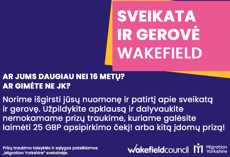„Migration Yorkshire“ šią apklausą atlieka Veikfildo savivaldybės užsakymu. Apklausos rezultatai padės keisti Veikfildo savivaldybės planavimą ir paslaugų teikimą. „Migration Yorkshire“ padeda organizacijoms tobulinti į JK persikėlusiems žmonėms teikiamas paslaugas. Tyrimo rezultatų santrauka bus paskelbta „Migration Yorkshire“ ir Veikfildo rajono savivaldybės svetainėse. Nenurodysime jūsų vardo, pavardės ar kitų duomenų, pagal kuriuos būtų galima nustatyti jūsų tapatybę.